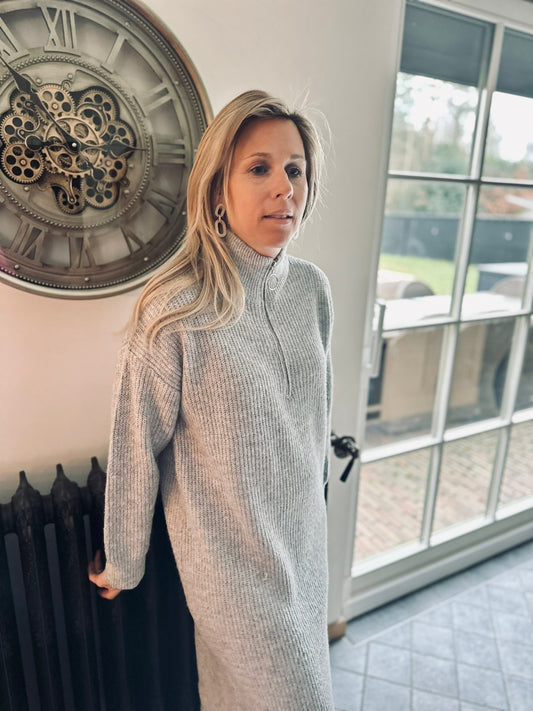 Lange jurk met opstaande kraag en rits grijs